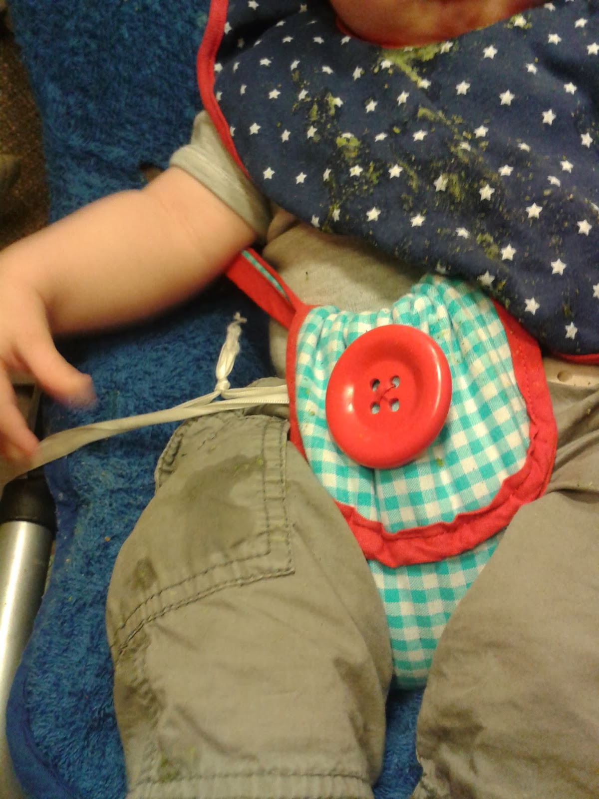 Buiten dat; als het nog net niet allemaal is doorgeslikt moeten ook de vingers wel weer mee de mond in. Want ja; fruit is lekker, maar wel MET vingers. Groente is lekker; maar wel MET vingers. Echt werkelijk alles zit er vervolgens onder (haar, neus, wangen, mond, slab, armen, handen en omdat hij de laatste tijd als nieuwe 'tic' heeft om zijn beentjes op te trekken en zijn knietjes vast te pakken; ook zijn broek. Oh en natuurlijk de wipstoel.